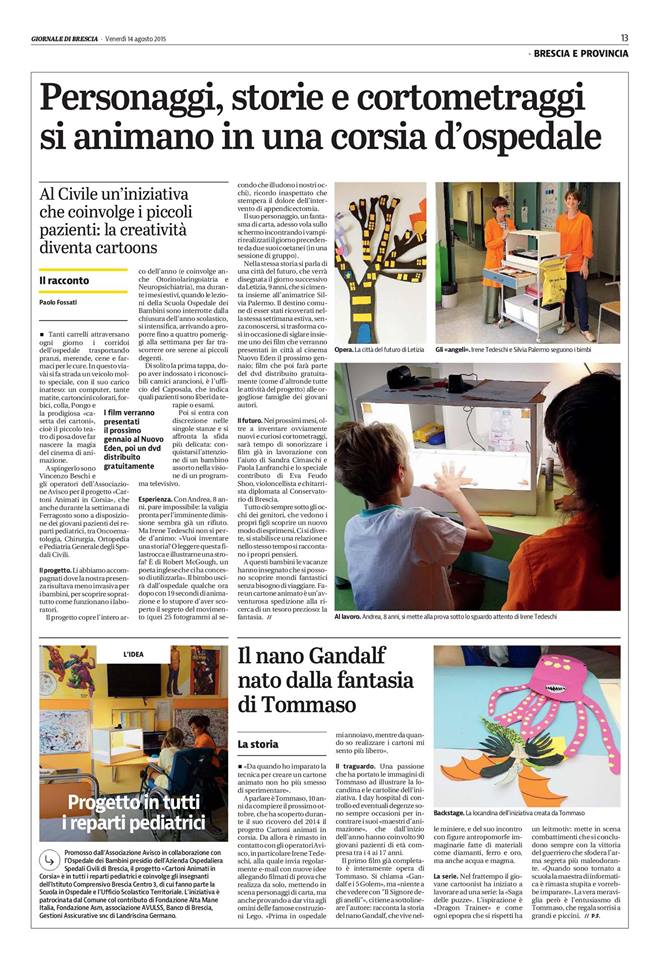 Nei giorni scorsi l’amico giornalista Paolo Fossati ci ha accompagnati nelle corsie dell’Ospedale dei Bambini, è entrato con noi nelle stanze e ha conosciuto i giovani pazienti animatori con cui abbiamo lavorato. Ci ha fatto tante domande, ha scuriosato nei cassetti del carrello, si è affacciato alla Casetta dei cartoni, ha sfogliato il quadernone dei personaggi e dei pensieri che ci segue da ormai 2 anni. Ha fatto foto, preso appunti, tirato fuori il suo portatile per abozzare l’articolo ancora immerso nell’esperienza. Non contento ha pure telefonato a Tommaso, un giovane animatore che ha realizzato il suo primo film d’animazione dal titolo ‘Gandalf e i 5 golem’ per conoscerlo e intervistarlo. Paolo, è stato un vero piacere averti con noi e leggere il testo che con parole semplici, concrete e significative racconta un progetto che ci sta molto a cuore. Buona lettura!